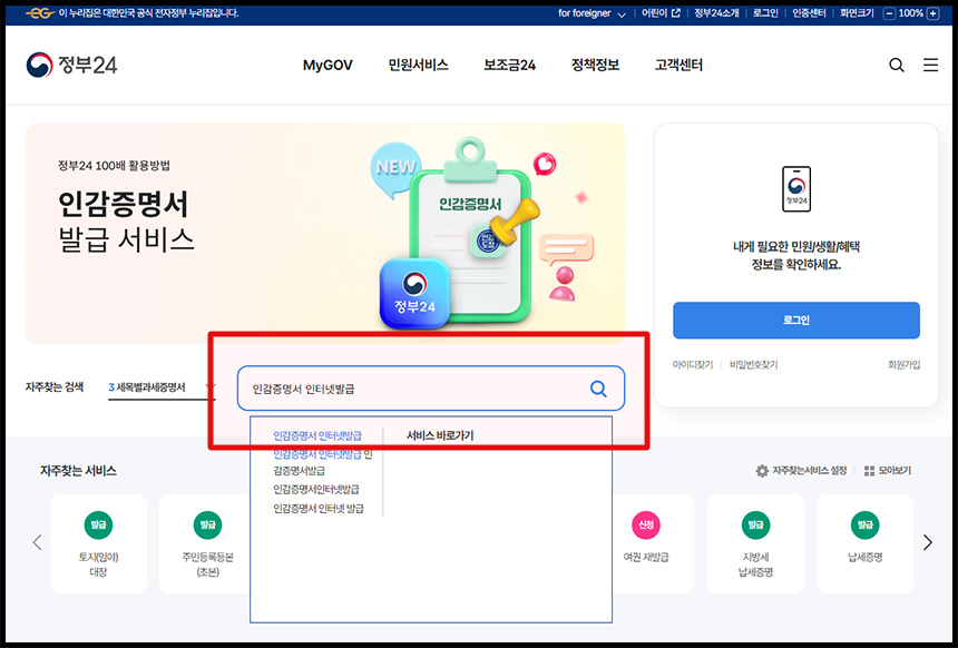 정부24 메인 화면에서 '인감증명서 인터넷 발급'을 검색합니다.