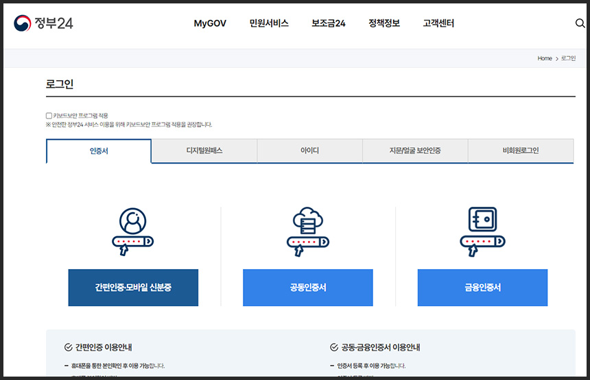 - 준비물 : 공동인증서 혹은 금융인증서