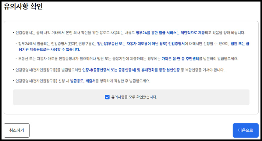 - 주의 : 법원, 은행 대출 신청 목적의 인감증명서는 방문 발급만 가능