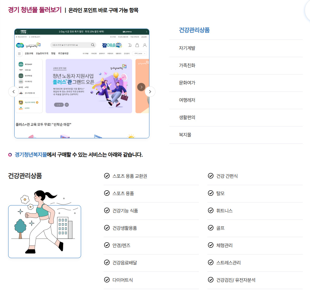 지급된 포인트는 ‘경기청년복지몰’ 앱에서만 사용 가능하며, 사용처는 다음과 같습니다.