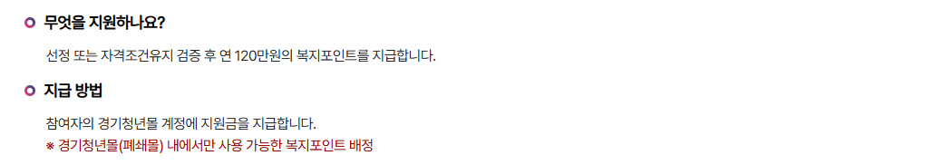 포인트는 ‘경기청년복지몰’에서 다양한 용도로 사용 가능하며, 총 2만 명을 선발해 연 2회(1차, 2차)로 나뉘어 진행됩니다.