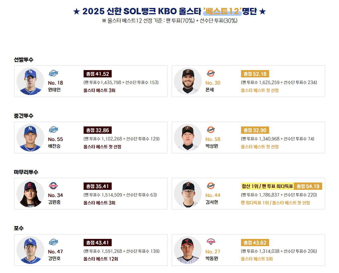 📊 선정 기준 : 팬투표 70% + 선수단 30%
